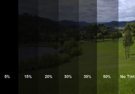 We offer our performance tint brands in several tint levels. The percentage indicated is the amount of visible light that enters through the window. The most common tint levels are between 30-50%; 35%, for example, indicates that 65% of the light is prevented from getting through the window and 35% of the light is allowed, see the sample image below for examples of tint levels.
